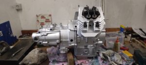 Motor samlet. Det er en malet motor – den så ret afpillet ud så jeg har nymalet motor, gearbox og bagsvinger. Desuden fået vandpoleret ventildæksler og bundkar, nye rustfri unbrako,